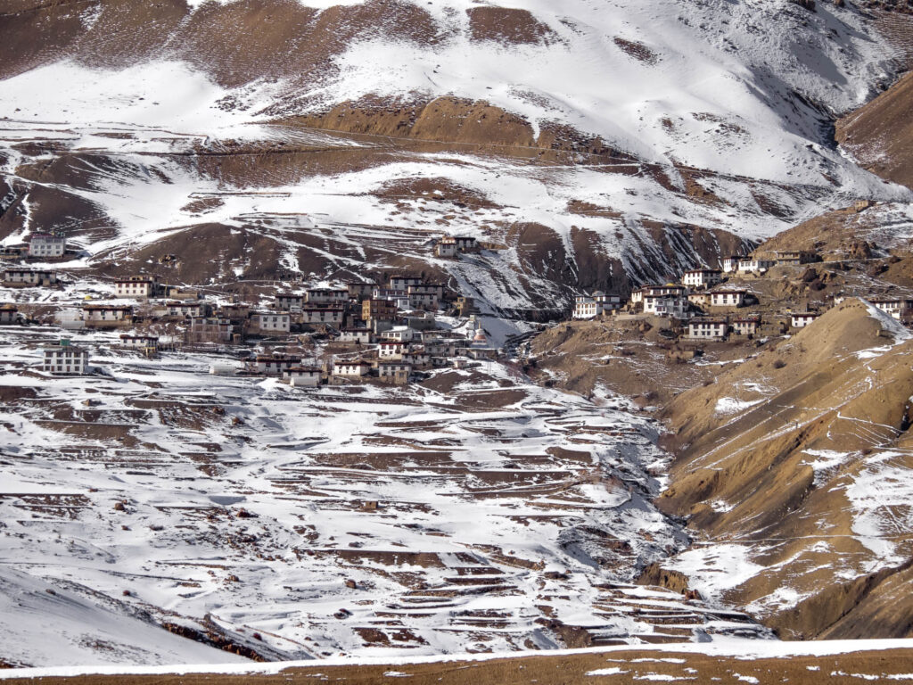 El paisaje de Spiti aporta escenarios limpios y de gran escala: cordones montañosos nevados, farallones rocosos, ríos helados y chortens. Sumaremos capas culturales con el Monasterio de Key (Key Gompa) y las aldeas de Kibber y Chicham, ideales para planos ambientales que sitúen a la fauna en su territorio humano y espiritual. Si el clima lo permite, aprovecharemos la hora azul y noches despejadas para astrofotografía y ambientes nocturnos.