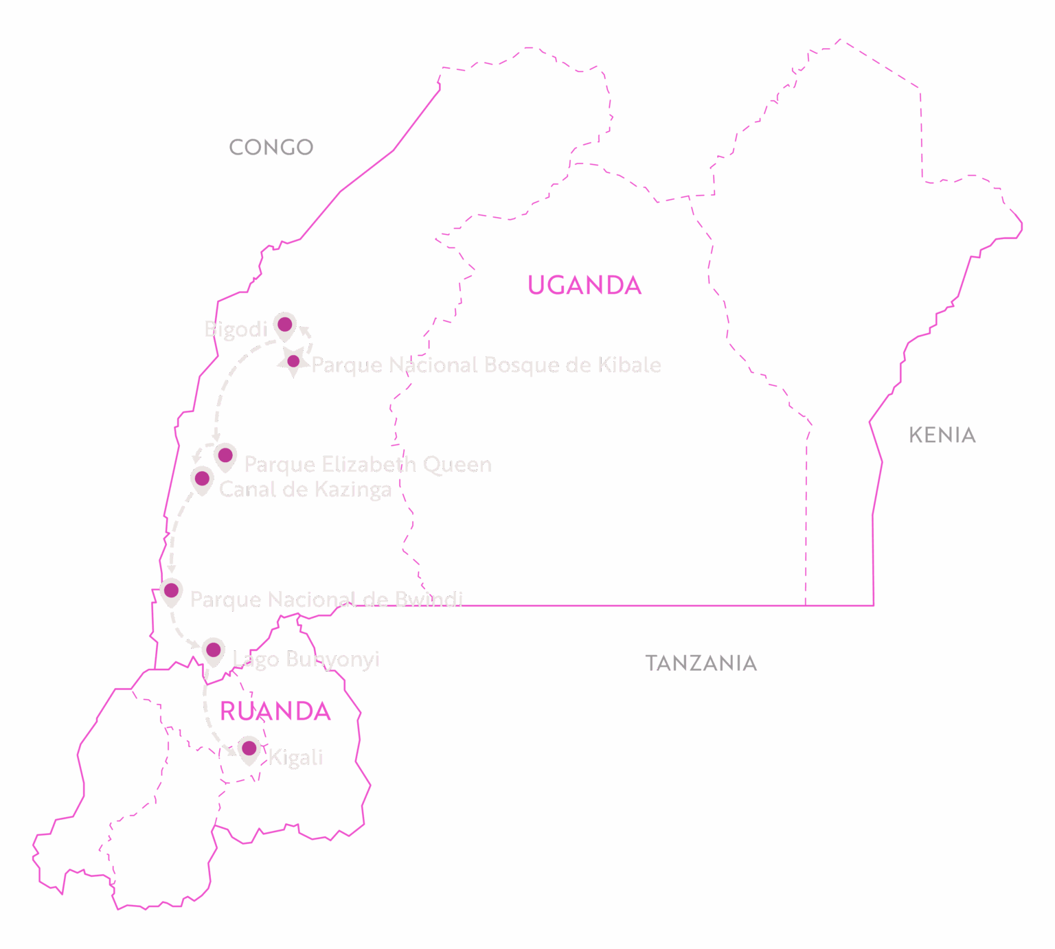Este itinerario ha sido trazado para aprovechar al máximo el tiempo en campo, garantizando accesos fotográficos exclusivos, salidas al amanecer y asesoría personalizada durante todo el recorrido. Finalizaremos el viaje cruzando la frontera con Ruanda para salir desde Kigali, lo cual evita el regreso a Entebbe y permite cerrar la expedición con una jornada más ligera antes del vuelo internacional.